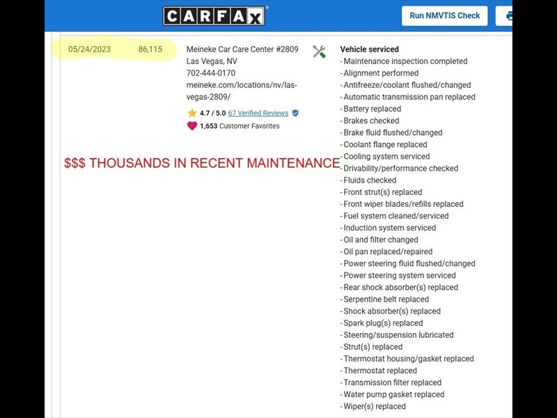 Check out the Carfax report for the long list of impressive recent maintenance on this car, including servicing of transmission/coolant/brake fluid/fuel system/power steering fluids, tune up, struts/shocks, thermostat, serpentine belt, oil pan gasket, wiper blades, and battery.