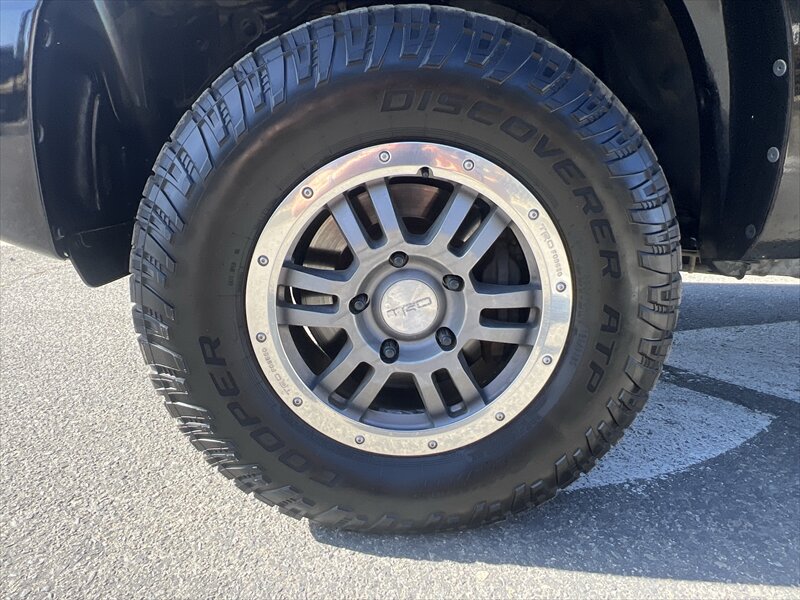 - TRD Off-Road PackageIncludes offroad suspension, Bilstein shocks, 18 in. x 8 in. alloy wheels, P275/65R18 BF Goodrich Tires, fog lamps, sliding rear window with privacy glass, engine skidplate, fuel tank skidplate, front tow hook and TRD Offroad Package graphics.